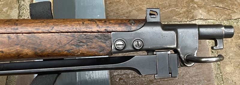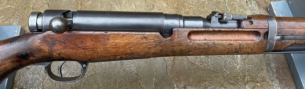 The Type 44 entered production in 1911 and entered service in 1912 (the 44th year of the Meiji period, hence "Type 44") and served on until the end of the Second World War in 1945. Production of the rifle ran until 1942. Approximately 91,900 Type 44 rifles were produced by Japanese arsenals during these years. There are three main variations of Type 44s, differing primarily in the size and shape of the bayonet fixture. This example is the first variation, which is relatively small and is fitted to the barrel. The later two variations are bigger in order to provide greater strength to the bayonet mount |