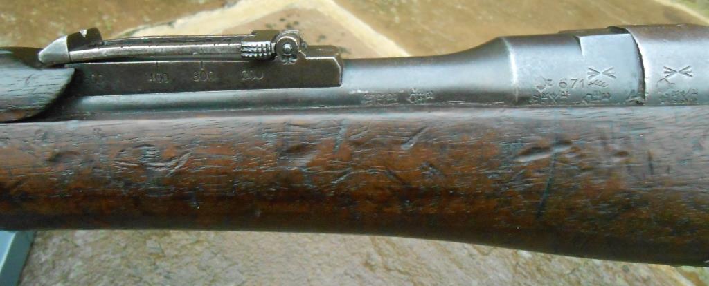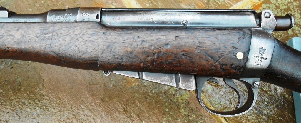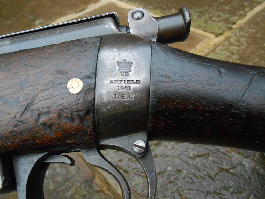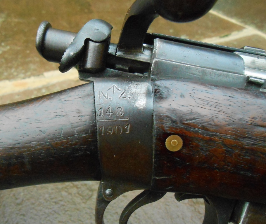 a bayonet. From early 1901 these carbines were issued to some 6th and 7th Contingents. In February 1902 the 7th NZMR Contingent was engaged in severe action and in one battle suffered 65 casualties. When the first contingents of NZ Mounted Rifles arrived in South Africa in November 1899 they carried single shot .303 Martini-Enfield Carbines. These soon proved to be inadequate against the fire power of the Boers armed with clip loading Mausers. So in April 1900, while camped at Springfield, Bloemfontein the NZ troops were issued with Lee Enfield and Lee Metford Cavalry Carbines obtained from the British. These solved the fire power problem but they did not have bayonet bosses. Tactically our ‘Rough Riders’ were not deployed as cavalry who fought on horseback but as mounted infantry. It was expected that they would engage the enemy on the ground where a bayonet would come in handy, Hence the urgent orders for 1500 NZ carbine that would accept a bayonet We now have this rifle, the butt making disc is missing, so a replacement has been fitted. This Rifle was in Africa During the Boer War with the NZ Mounted Troops & Almost Certainly Used on Active Service Very Rare - Historically Important Rifle