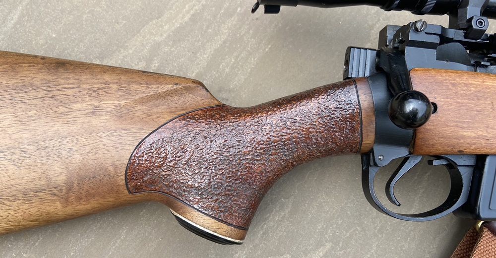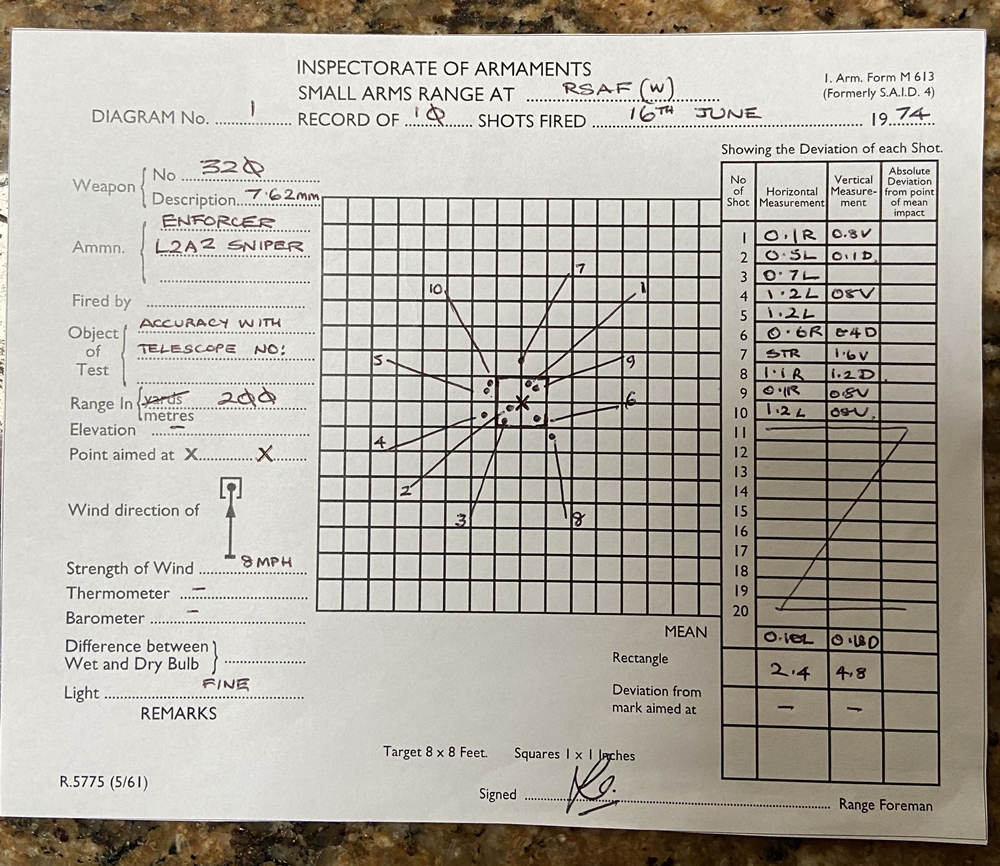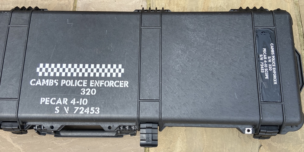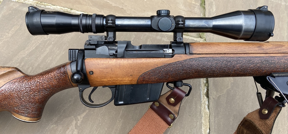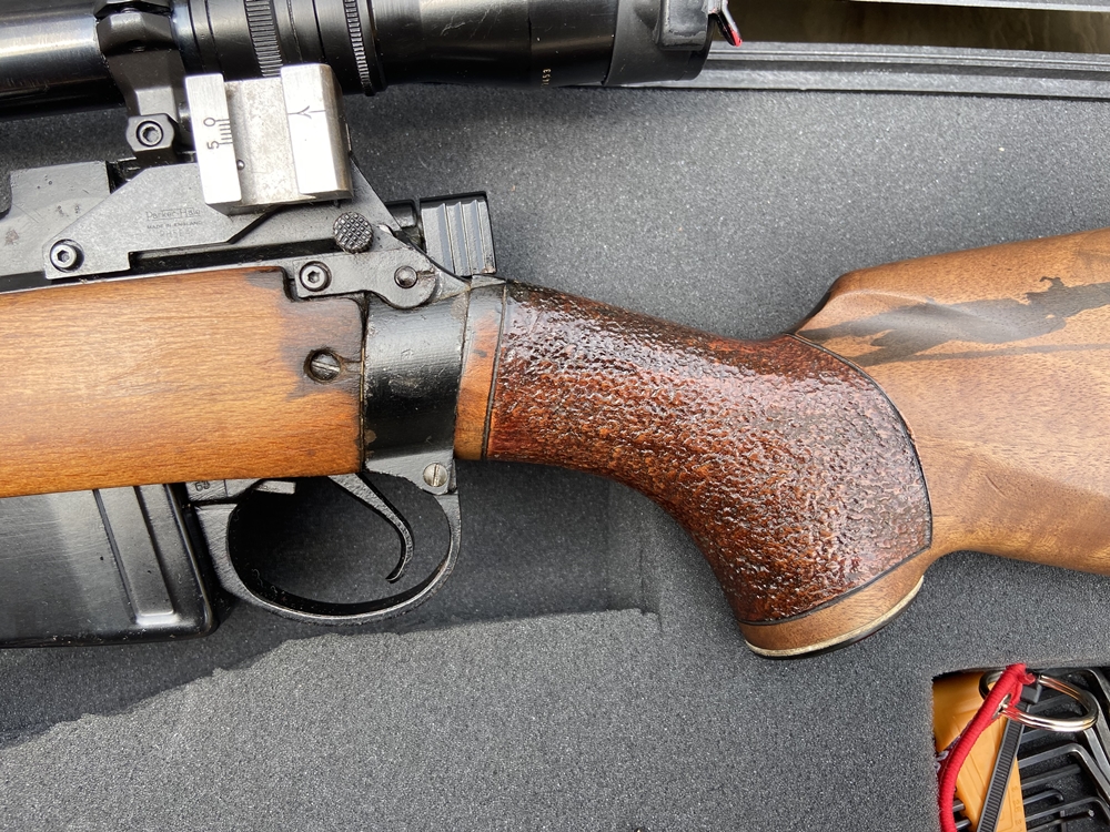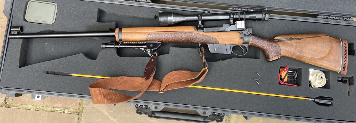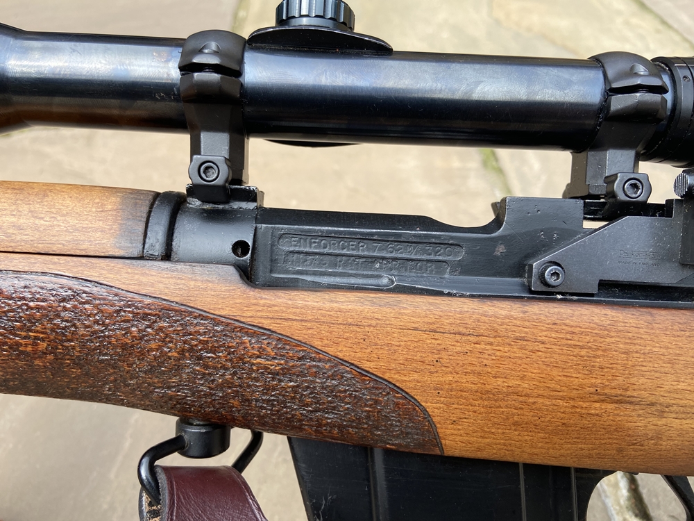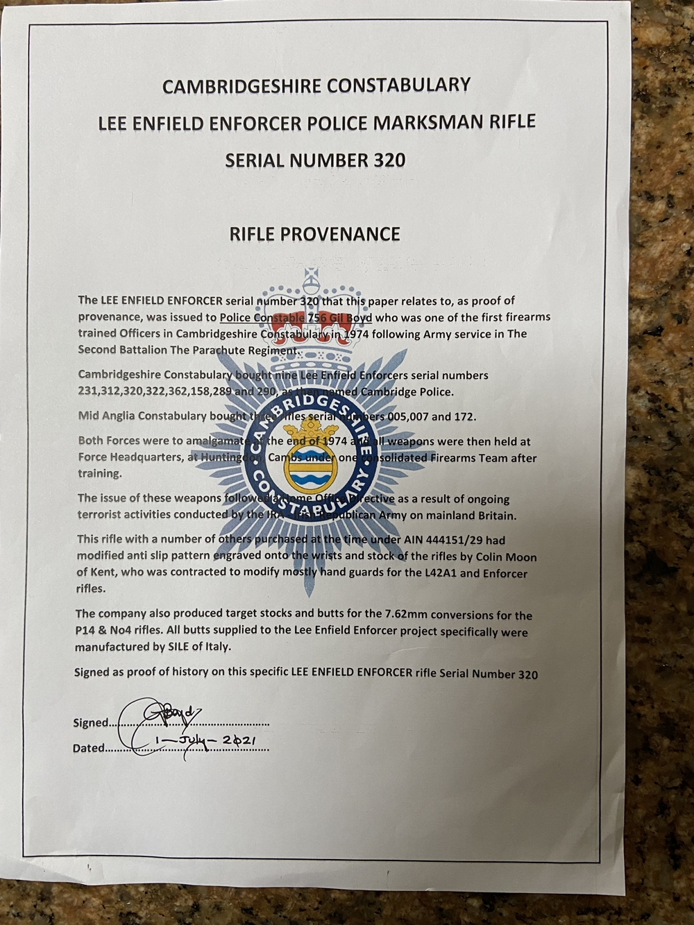 The Enforcer Sniper rifles are rarer than No4Ts & L42A1s rifles because of the small quantities manufactured (767) and around 50% were destroyed. Comments on this Enfield Enforcer This Rifle was used by Gil Boyd BEM who set up the Cambs Firearms Department. Gil is still the current owner, and has included a signed statement with the rifle on its History, he also set up their underwater team. Career History The 2nd Battalion The Parachute Regiment then Regimental Sergeant Major, 164 Provost Company Royal Military Police and ARRC (V) JHQ Rheindallen. Cambridgeshire Police Principal Technical Officer, Technical Support Unit He set up the Airbourne Museum at Duxford, and wrote several books including, Snipers Down South in the Falklands. The Anti Slip was completed by Colin Moon - Special Request by Cambs Police Colin Moon was also a Sub-Contractor to the Royal Small Arms Factory Enfield The left side of the action has suffered a little bit of corrosion, but has had the rust removed & original suncorite finish applied again. There is a bit of a oil stain on the butt, casued by gun