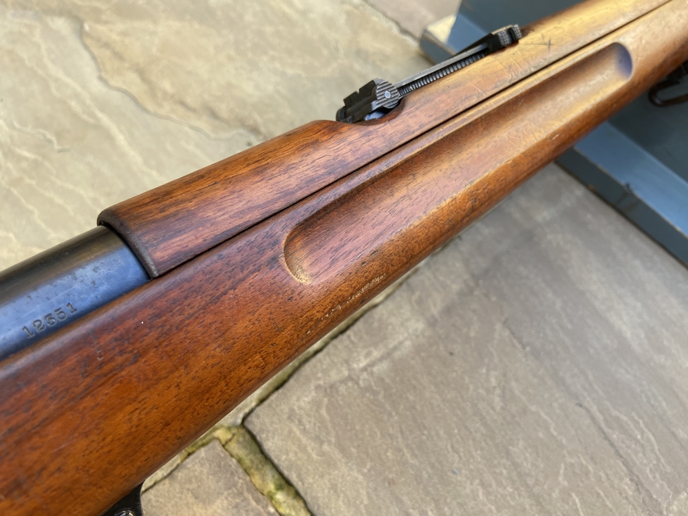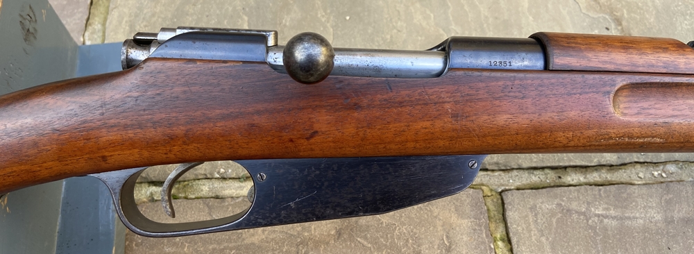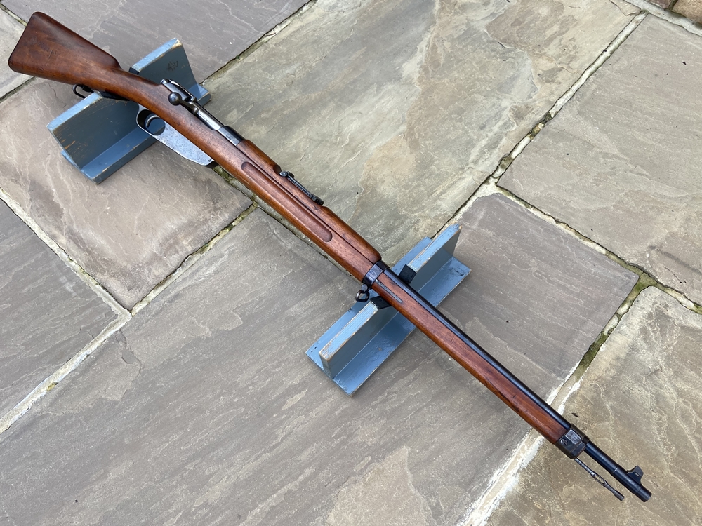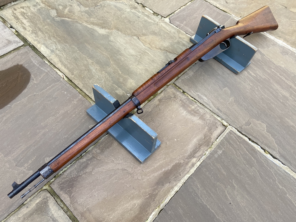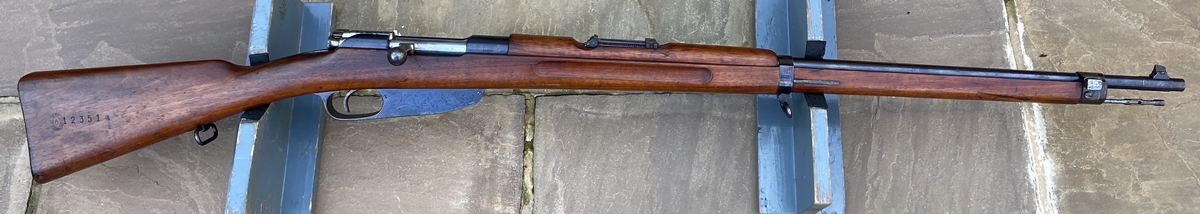 *** SOLD *** Very Good to Excellent Condition These 1912 Irish Contract rifles look very close to the M93 Romanian Mannlicher, but these rifles were produced with left over parts from the M1892 Romanian Mannlicher. The rear sight is similar to the M95 Austrian rifle, graduated to 1800 schritt. Matching Serial Numbers: Action, Barrel, Bolt, Stock Bore Very Good to Excellent - Proofed this year (Discrete Proof Marks) *************************** This rifle was originally part of a cache of arms involved