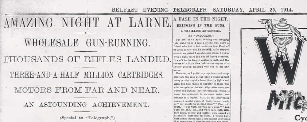 in the Larne gun-running operation. Crawford secured the services of the S.S. Fanny to transport 216 tons of arms and ammunition, and amongst that consignment were 11,000 Mannlicher rifles built by Steyr in Austria. The arms were loaded aboard the ship on 30th March 1914 on the Baltic island of Langeland and she was ready to set-sail when Danish Customs seized the ship's papers. They had thought the arms were destined for Iceland where there was growing dissent by militants who sought independence from Denmark. However, the Fanny managed to leave harbour and steamed into a gale to hide from her pursuers until she was in international waters. Meanwhile, Crawford had bought another ship, the S.S. Clyde Valley, and she steamed out to meet the Fanny off the Irish coast and on the 19th April, the entire cargo was transferred between vessels. The crew then falsified the ship's name and the Clyde Valley became the S.S. Mountjoy II. It had been arranged that another ship would enter Belfast Lough and arouse Customs suspicions to act as a smokescreen to the real operation that was about to take place at Larne. The 'Mountjoy II' docked in Larne harbour without hindrance and her cargo was transferred into two smaller vessels that took it to Donaghadee. Here the arms were transferred into many hundreds of motor cars, as the Belfast Evening Telegraph later reported, "It was an amazing sight to see this huge procession of cars stretching nearly three miles in length descending upon the town with their headlights ablaze". The guns and ammunition were then taken to safe houses and secret dumps. This was the very first time that motor vehicles (civil