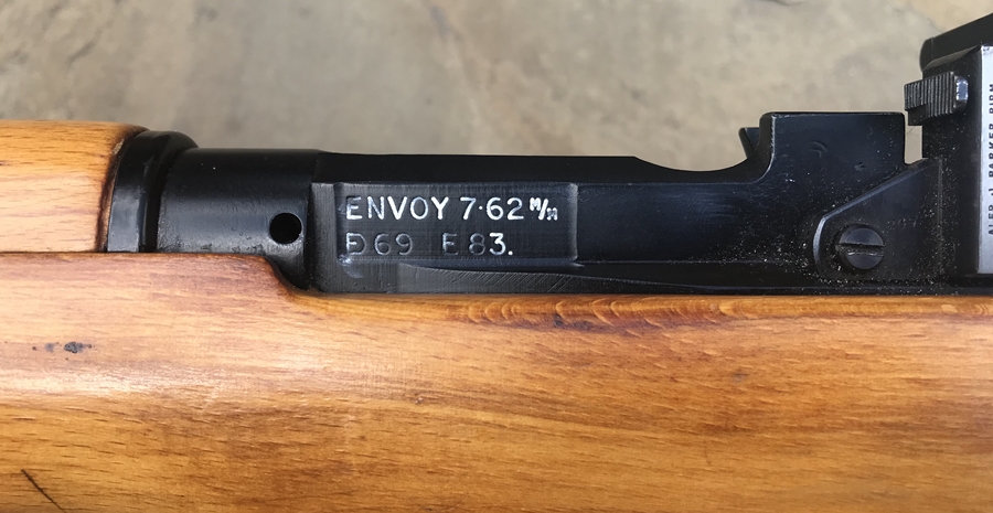 *** SOLD *** Very Good Condition A very nice 7.62mm Enfield Envoy Circa 1969. Matching original numbers including magazine The Envoy was built at RSAF Enfield as a commercial venture for civilian target shooters. This example remains in great condition, the fore-end has been fitted with an accessory rail. Excellent Bore Gauging at 0.297" |