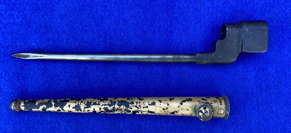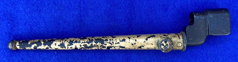 This is the No4 MkII bayonet that was designed to replace the MK I Cruciform bayonet The Mk II was cheaper & quicker to produce because it omitted the four milling cuts required to create the fullers required for the cruciform profile We have a small batch of these still with their Middle East / Desert WW2 era painted scabbards Swords, Bayonets & Knives